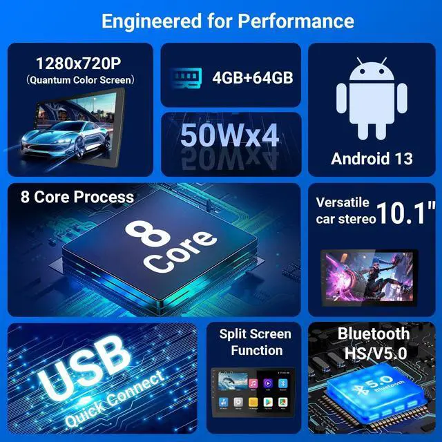 10.1 Inch Android 13 Car Stereo with 4G+64G & 8-Core Processor Experience ultra-fast performance with an 8-core processor and ample 4GB RAM + 64GB storage. Enjoy seamless multitasking, smooth navigation, and effortless app downloads for a smarter driving experience. ^^ Wireless CarPlay & Android Auto + Dual-Band WiFi & Bluetooth 5.1 Connect effortlessly via wireless CarPlay and Android Auto, or use dual-band WiFi and Bluetooth 5.1 for stable, high-speed streaming, hands-free calls, and easy smartphone integration. ^^ 720P HD Touchscreen with Split-Screen & Picture-in-Picture Navigate, play media, and view reverse camera footage simultaneously on a vibrant 720P HD display.