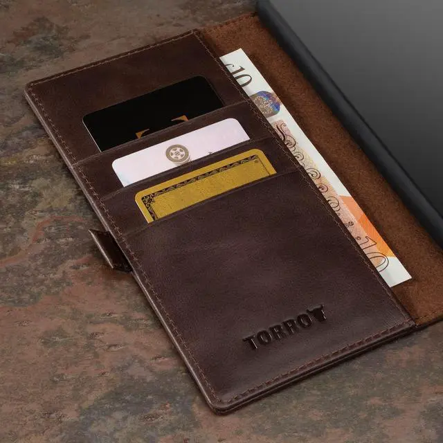 The case also features credit card slots as well as a larger compartment for notes. The side magnetic clasp ensures a secure closure while maintaining an overall slim profile.