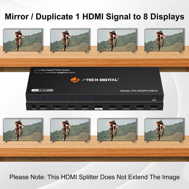 Please note that this HDMI Splitter only duplicates (mirrors) the source signal on all connected displays, and does not extend the screen. ^^ Features 1 Input 8 Output HDMI Splitter for