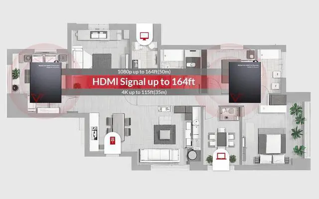 • Watch Your Devices in Another Room No Long HDMI Cable NeededEasily extend your TV, streaming box, or PC to another room using a single Cat6 cable. Perfect for home theater setups, bedrooms, offices, and meeting rooms.