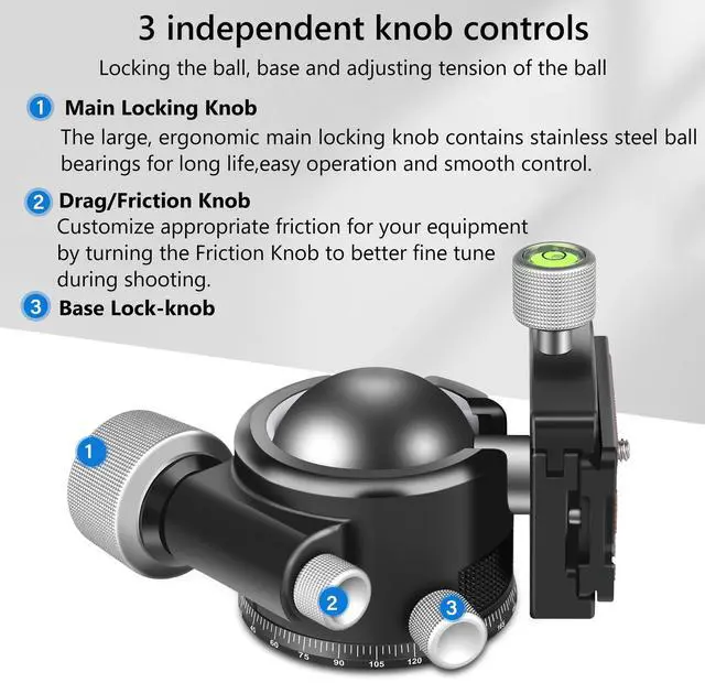 High Bearing CapacityThe KB44 uses a 44mm super-large sphere, the ultimate diameter of the ball gives it ultimate weight capacity and stabilityMax Load 66lbs /30kg. The master lock knob features stainless steel ball bearings for a lifetime of silky-smooth control and powerful locking. ^^ Drag/Friction Knob DesignDrag/Friction knob for better control of the tension. Enjoy control and consistency with the micrometer drag tension adjustment, guaranteeing repeatable and reliable performance in every shooting scenario. Precise motion control for accurate composition. ^^ Dual Drop-notches DesignThe KB44 offers up to 45-degrees of tilt in all directions, and up to 90-degrees in the two drop-notches.