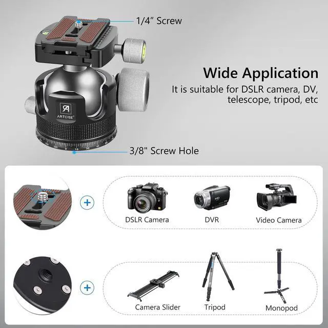 Dual drop-notches allow maximum flexibility for positioning the camera for portrait-orientation or extreme angle shots. ^^ High-quality Materials and Superb CraftsmanshipThe tripod ball head was made of high strength aluminum alloy, advanced CNC manufacturing process and surface anodizing treatment technology, CNC machined components for exacting precision and dependability. It is very strong and durable. ^^ Wide Range of ApplicationsRemovable quick-release plate, comes with 1/4 screw and safety lock, suitable for most DSLR cameras, camcorders, telescopes; the bottom screw hole is 3/8, can be widely applied to various professional tripods, monopod, slider and other stands.