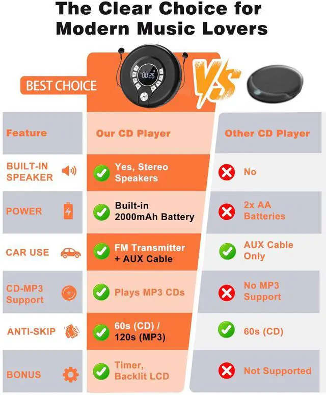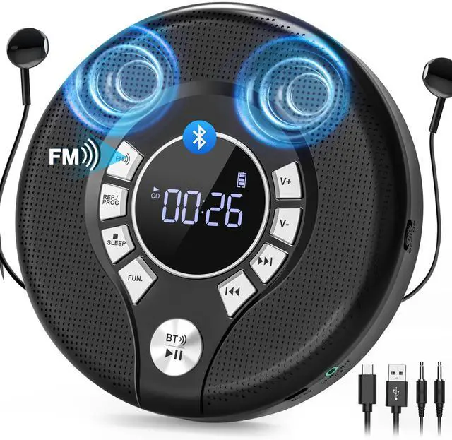 Please Note: No FM Radio, the bluetooth function does not support transmission to car Bluetooth systems ^^ Anti-skip & Advanced ControlsAdvanced anti-skip technology (60-sec for CD, 120-sec for MP3) ensures smooth sound whether youre running or riding. Backlit LCD + programmable play + sleep timer make operation effortless. With Bluetooth connectivity, you can also control playback wirelessly from your device. Its more than a Discman its your all-scenario music partner. ^^ Long-Lasting & RechargeablePowered by a reliable 2000mAh battery, this rechargeable CD player delivers over 9 hours of continuous playtime (even with Bluetooth use). The modern USB-C charging port (full charge in ~4 hours) works with power banks and car chargers, making it perfect for camping, commutes, or power outages. ^^ Crisp Sound, Indoor or OutdoorJam out loud with built-in stereo speakersmaking this the go-to portable CD player with speakers for home parties, picnics, or cozy nights. Prefer personal listening? Just plug in any 3.5 mm headphones, and youve got a premium portable CD player with headphones. ^^ Modern Reliability, Vintage VibesWe've combined the nostalgic feel of a classic Walkman/Discman CD player with modern technology, now enhanced with Bluetooth capability.