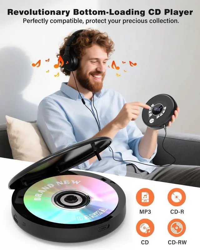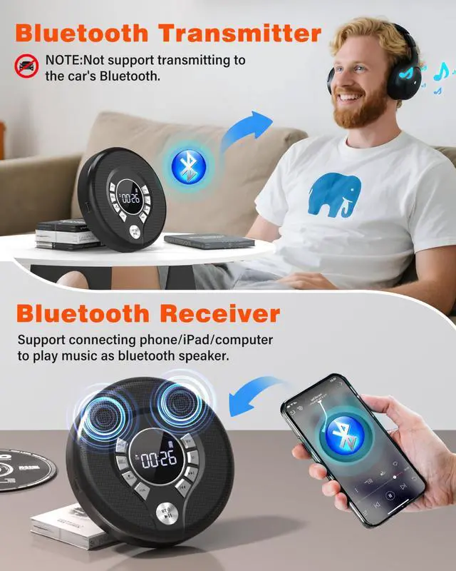 Newly Upgraded Bluetooth Retro Music PlayerThis versatile Bluetooth Discman CD player Supports CDs, CD-R, CD-RW, and MP3 formats, also works as a USB music player now with Bluetooth Transmitter & Receiver. Stream your CDs wirelessly to Bluetooth headphones or speakers, or connect phones/tablets to play through the built-in speakers. Complete with a detachable lanyard, its the perfect portable CD player with Bluetooth for music lovers on the move. ^^ Wireless Car Play Made EasyTurn any car into a stereo stage! As the top-rated portable CD player for car use, it connects via AUX cable or wireless FM transmitter ( 87.5108MH z) to your car radio.