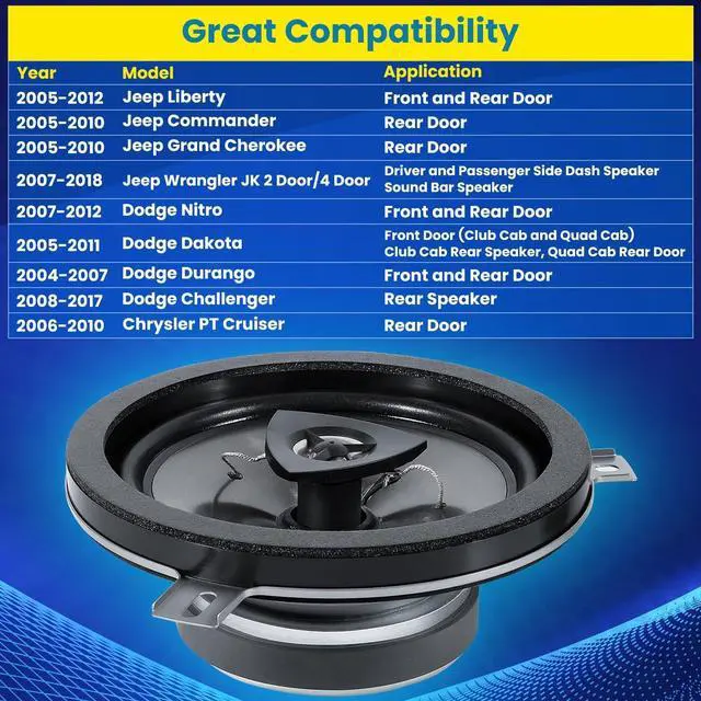 4 Pack Speaker Upgrade For 2007-2018 Jeep Wrangler JK JKU & Grand Cherokee, Commander, Liberty, Dodge Challenger, Durango, Dakota, Nitro, Chrysler 6.5 Inch 2-Way Car Audio Speaker Replace OEM 77KICK10