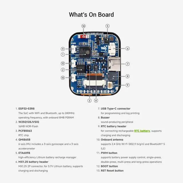 Battery Management: Includes an onboard QMI8658 6-axis IMU (3-axis accelerometer and 3-axis gyroscope) for motion tracking and step counting, along with a PCF85063 RTC chip, and a battery slot (SH 1.0 ) that supports charging, enabling accurate timekeeping and power management. ^^ Versatile I/O and