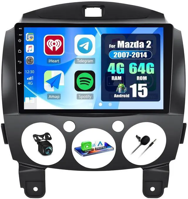 Android 15 Car StereoFits for Mazda 2 2007-2014. Android system Quad 4 Core and 4GB RAM + 64GB ROM ensure smooth operation and fast response. 9 inch capacitive 2.5D tempered glass touch screen, with high resolution 1280*720 IPS. Clearer picture and richer colors. ^^ Built-in Wireless Carplay & Android Auto& Mirror linkBulit in Wireless Carplay & Wired Android Auto, support to use smart voice assistant or touch the display, you can make calls, send and receive messages, and enjoy music etc. A smarter, safer and more fun way to use your phone in the car, and keep you stay focused, connected and entertained.