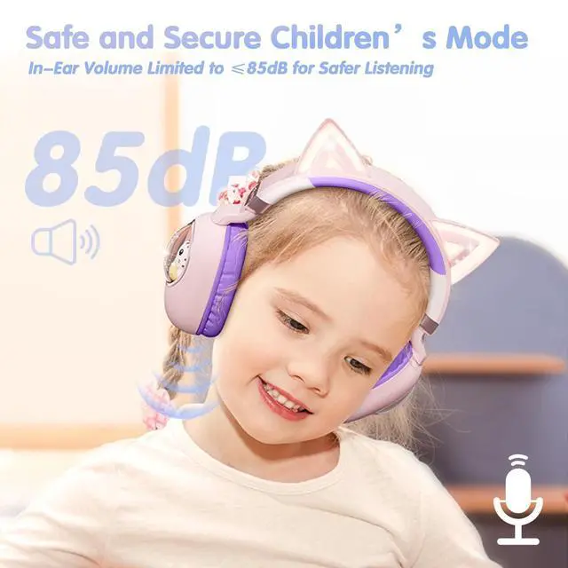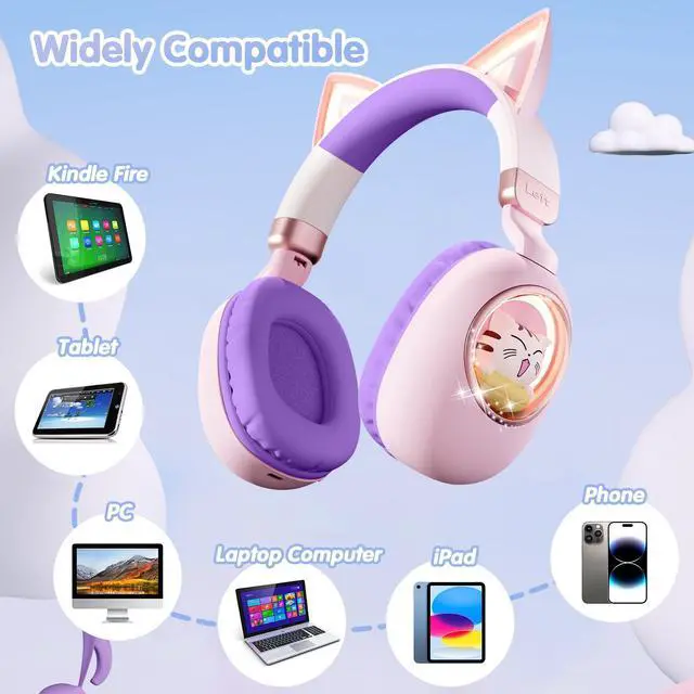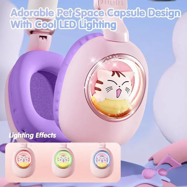 Adorable Space Capsule DesignFeaturing a playful space capsule design and vibrant RGB lighting, these cat headphones for kids are perfect for kids who love fun and stylish accessories. The eye-catching lights add an extra touch of excitement, making them a hit for any occasion. ^^ Superior ComfortFeaturing a silent-stretch headband that adjusts smoothly to any head shape without tangling hair. The soft ear cushions ensure hours of comfortable wear. Multi-axis rotating hinges allow compact folding in seconds! Toss it into backpacks or travel bags effortlessly. ^^ Safe Listening with Child ModeProtect young ears with our built-in Child Mode, limiting volume to a safe 85dB.