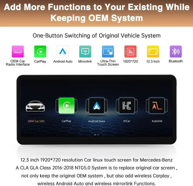Pre-shopping NotesThe car touch screen for Mercedes-Benz A CLA GLA Class 2016-2018 with NTG 5.0 system, Not fit for NTG 4.0 / 4.1 /4/2 System. Pls Confirm the system and car model to buy!!! If you are unsure, pls ask for help from us. ^^ 12.3 Inch 1920*720P Ultra-Thin Touch Screen Display With the IPS display touch screen, high-resolution image quality. The HD display delivers outstanding clarity, contrast, and brightness. Catch every single sharp, vivid, and vibrant picture from virtually any vantage point; It supports AHD 720P/CVBS NTSC/PAL camera.