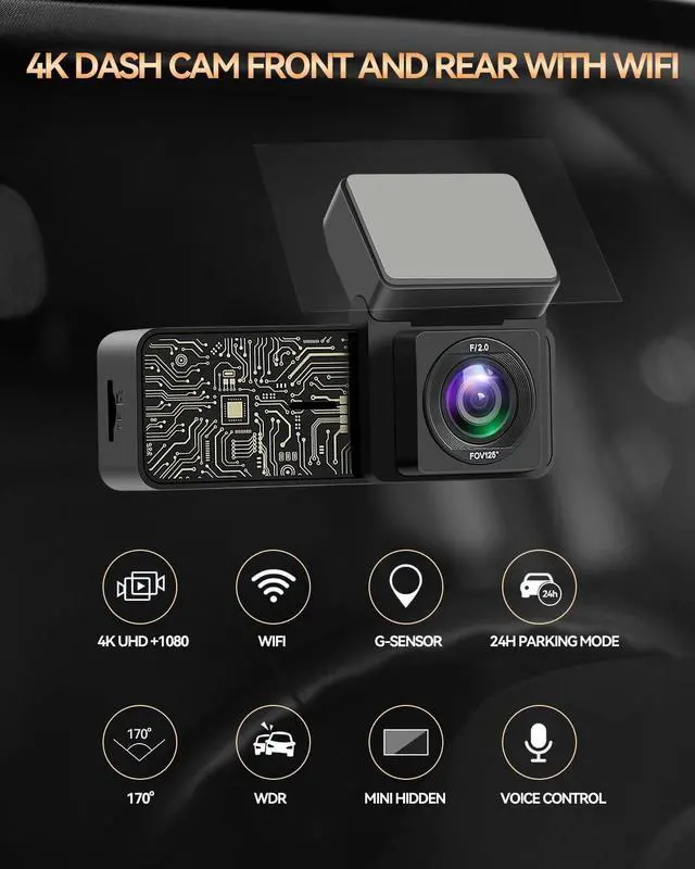 4K Front Camera + 1080P Waterproof Rear Camera - SPADE dashcam front camera supports up to 4K 3840*2160 resolution, delivering cinematic and smooth 4K image quality. The driving recoder has the front wide angle of 170 degree and covers four lanes, rear 1080P dash camera which providing present evidence of sudden carsh during driving (Note: The dash cam input by Type C port). ^^ WIFI Dash Cam with App Control - The car cameras front and rear built-in WiFi showing your scenic drives on the phone in real-time, it allows you update your travel blog on the go. It's so easy and convenient to share the travel scenery and wonderful moments with your family and friends through the app, easy to download important recording for insurance claims. ^^ Night Vision WDR Dash Camera - This dashcam front and rear camera equipped WDR technology, it intelligently adjusts to light variations, preventing overexposure and preserving every detail in your recordings when navigating through tunnels or facing sudden intense light. ^^ Compact Mini Dash Cam with Voice Control - The front and rear dash cam with mini and lightweight design, it's easy to mount behind the rear view mirror and goes virtually unnoticed, which won't obstruct your vision while driving. Speak the voice command, it will listen and follow your command. Free your hands, enjoy the road trip. ^^ 24hour Parking Mode Safety Protection - When the dash camera for cars front and rear connected to the dedicated hardwire kit, it can continue recording at low frame rate mode even when you turn off your cars and get away.