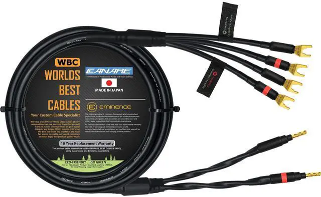 Custom Made - 4 Foot - Canare 4S11 - Audiophile Grade - HiFi Star-Quad Bi-Wire Single Speaker Cable for Center Channel, terminated with Eminence 24k Gold dual-plated, low-profile audiophile banana and multi-spade connectors (2x Banana to 4x Spade). The cable consists of four (4), 14 AWG conductors (11 AWG when paired as in this cable assembly). Please refer to the detailed images in this listing for cable information and further details on the connectors. We at WBC always make world-class custom-built cable assemblies using many of the leading cable and connector brands, if you are unable to find the length and type of cable you are looking for, please feel free to contact us, and we will strive to assemble the required cable for you.