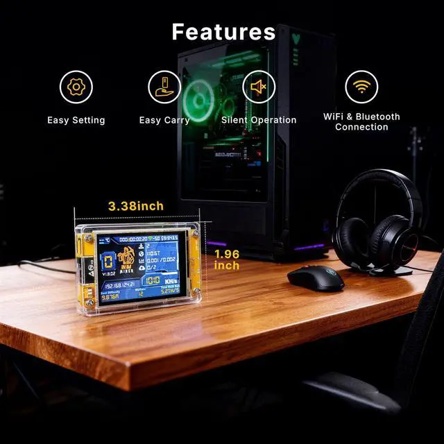 Powerful & Efficient Bitcoin Lottery MinerAchieve hash rates up to 1000KH/s with this Crypto Miner, designed for smooth and stable Solo Miner operations. Whether you're new to cryptocurrency or an experienced enthusiast, it delivers reliable performance for your mining setup. ^^ Ultra-Low Power & Silent OperationWith only 1.5W power draw and a fanless design, this BTC Solo Miner runs 24/7 without raising your energy bill or creating noise. Perfect for desktop, office, or home use. ^^ Real-Time Monitoring on 2.8" Smart Display Stay fully informed with a clear visual interface that shows live mining status, hash rate, power usage, and WiFi connection.