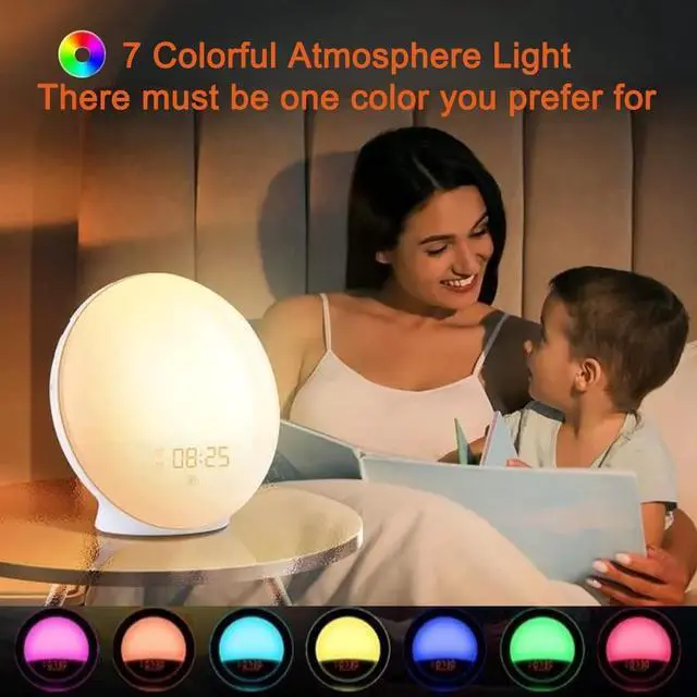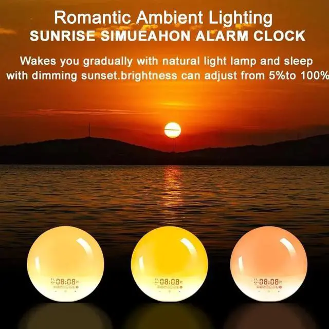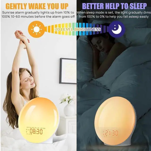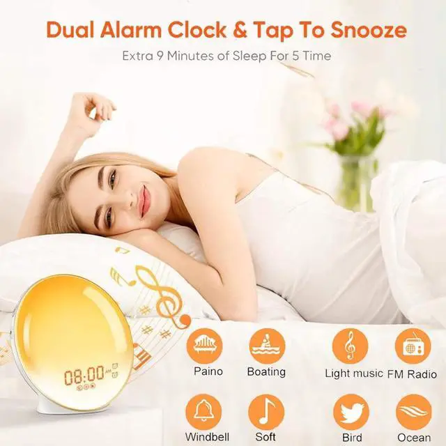 Sunrise Simulation Wake-Up Light Full-Screen Calendar and Time DisplayNew full-size LED display for easy time viewing, even from a distance. FM Radio and 7 Alarm SoundsListen to your favorite radio stations (76-108 MHz) or choose from a variety of alarm sounds including birdsong, ocean waves, wind chimes, and piano music to wake you up! Dual Alarms and Snooze FunctionSet two independent alarms for weekdays and weekends! Perfect for families or couples. Want to sleep in a little longer? Simply touch the "snooze" button for an extra 9 minutes of rest up to 5 times! Sleep Aid ModeChoose from 3 soothing sleep sounds or FM radio and set an automatic shut-off timer.