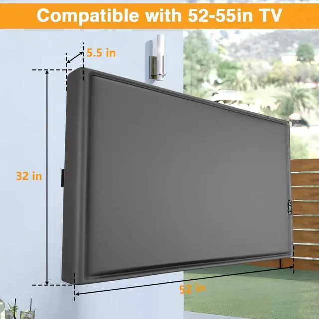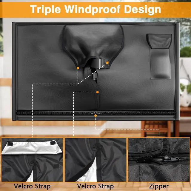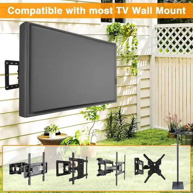 Coating Treatment: The TV cover undergoes PU silver coating treatment, It has the characteristic of a sun protection factor of UV 50+ and the ability of withstanding water pressure up to 9800 Pa. ^^ Dual Windproof DesignWe design dual windproof design, velcro straps and zipper, The cover is firmly fastened to the TV, even in windy weather, it will not be blown away. ^^ Remote Control Pocket DesignWe design the TV cover with a remote control pocket, easy to store your remote control and protect your TV remote control all day. ^^ Fit most universal TV wall mount bracketsOur cover compatible with most universal TV wall mount brackets like double wall mount, single wall mount, and tilting TV mount.