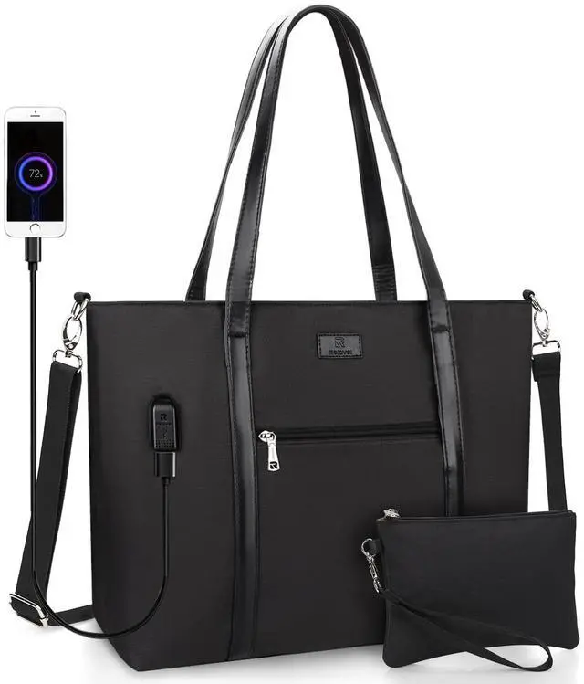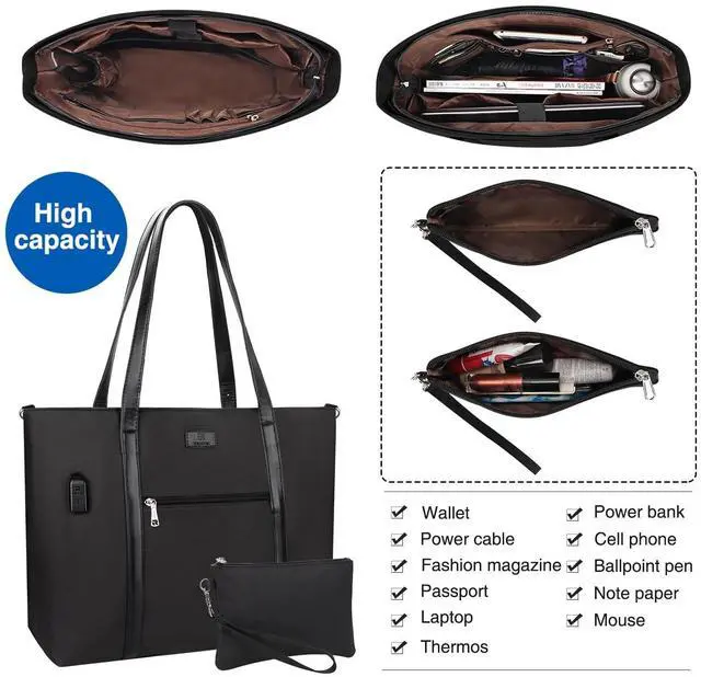 DescriptionSpacious and quality laptop tote bag with lots of pocket organizersFrom TanTo, a leading functional tote bag brand. Fashion and functional design, quality materials, excellent workmanship. 8+ years experiences in designing and manufacturing functional bagsRoomy computer tote bagSize of this purse is 44cm/ 17.3 in * 15cm/ 5.9 in * 33cm/13in (L*W*H). It fits laptop, laptop accessories (charger cord & mouse), writing utensils, planner, small files and moreMultiple sections and pockets3 pen holders2 zipper pockets (1 outside and 1 inside ) 2 mesh pockets1 water bottle/umbrella holder8 inside holdersBuilt-in USB PortUSB port is built-in on outside of the bag, charge your cell phones easily ( Power bank is not included )