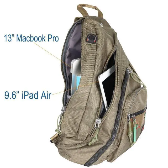 About This Laptop Sling Backpack: The compact, functional and durable laptop backpack is being manufactured by high quality water resistant Polyester Oxford. It's designed with multiple compartments to fit your various items. There is a laptop compartment inside the main pocket. It can hold up to 14 inch laptop. The shoulder strap is adjustable, it's wide and thickly padded with air mesh that can help you wear comfortably. What You Can Put in This Backpack? Laptop Compartment Is Great for Laptops(MacBooks, Dell, Thinkpad)up to 14 Inch.
