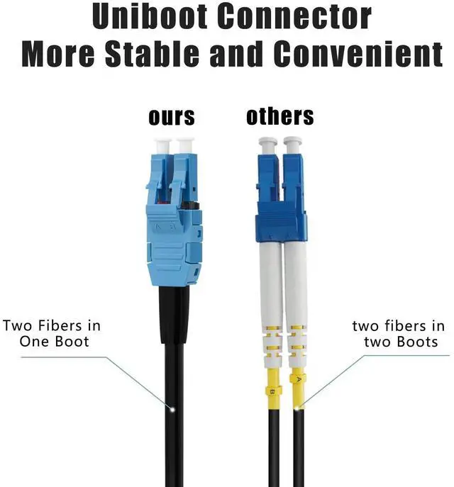 ^^ Space-saving Uniboot Connectors: Our LC duplex connector with uniboot is encased in a common housing with one boot, terminating on a single twin-fiber round cable. By using cable assemblies with LC Uniboot connectors, half of the space can be saved over traditional duplex cable. Uniboot single jacket patch cables make patch panel cable management considerably easier.