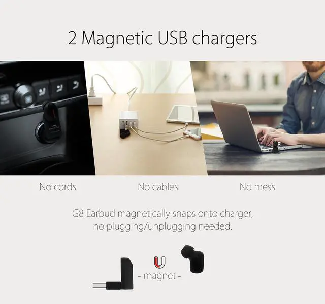 W/ 2 WIRELESS MAGNETIC CHARGERSIncludes 2 hassle-free magnetic USB chargers, leave 1 at home and 1 in vehicle. Make charging more convenient, simply line up G8 earbud to the charging pin and earbud will attach to it magnetically. Plug in anywhere a