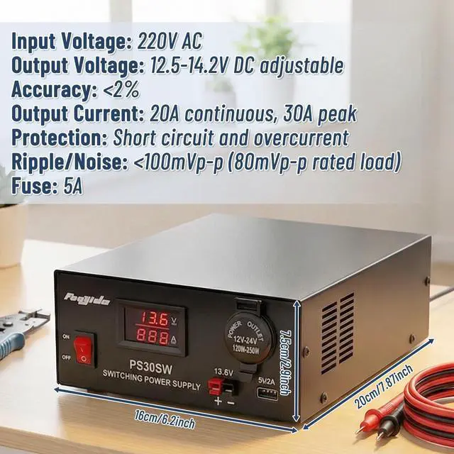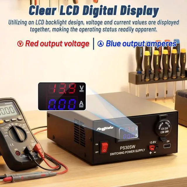 Bench 13.8V 30A power supply: Universal regulated power supply provides reliable AC to DC power conversion, internally fine-tuned output voltage 12.5 - 14.2V, 13.8V fixed output, switch control power supply, no need for other external power supplies. Designed with an LCD digital display, the voltage and current values are clear at a glance. It is compact and easy to carry. It is an ideal power supply for CB, amateur radio, GMRS and LMR two-way radios, scanners and all 13.8V equipment. ^^ 5V 2A