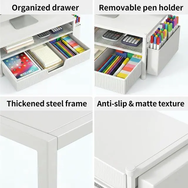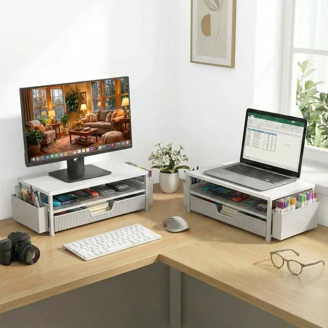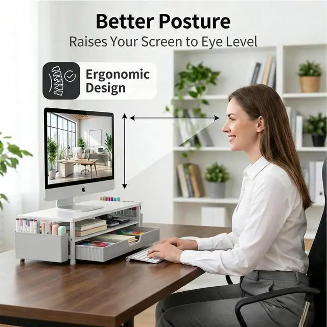 Ergonomic Eye-Level Comfort Elevate your screen to the perfect eye level to eliminate neck strain and slouching. ECOLOVI desk organizer monitor stand promotes a healthier posture, reducing fatigue during long hours of work or studying, so you can stay focused and productive all day