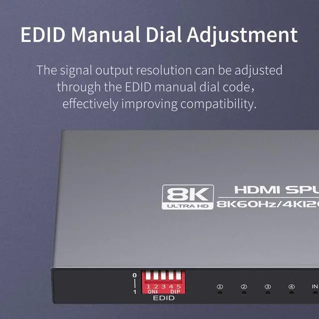 Audio Format: Support Dolby Atmos, DTS X, Dolby True HD, DTS-HD Master Audio, PCM 5.1 7.1. ^^ EDID ManagementAdopts 5-position EDID toggle switch, 22 kinds of EDID methods. There are multiple modes and multiple resolutions to choose from. (Please see the manual for multiple modes) ^^ Long Distance TransmissionThe 8k HDMI splitter can transmit HDMI output signals up to 26 feet (10 feet in, 16 feet out). The premise is to use HDMI 2.1 specification cable. ^^ Wide compatibilityCompatible with PC/Computer, PS4 Pro, PS5, Xbox series, Fire Stick, Apple TV, Blu-ray player, Chrome, ROKU 4, Set-top Boxes, Digital Cameras, Projectors and other HDMI devices.