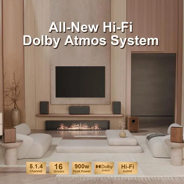 Soundbar: HiMuses M514 is a real 5.1. 4 channel Dolby Atmos home theater system with an independent center speaker, four surround speakers, and a dedicated subwoofer. With 900W peak power, it delivers room-filling sound, precise channel separation, and cinematic scale that typical soundbars simply cannot achieve. ^^ Clear Dialogue, Full Surround, Deep 25Hz