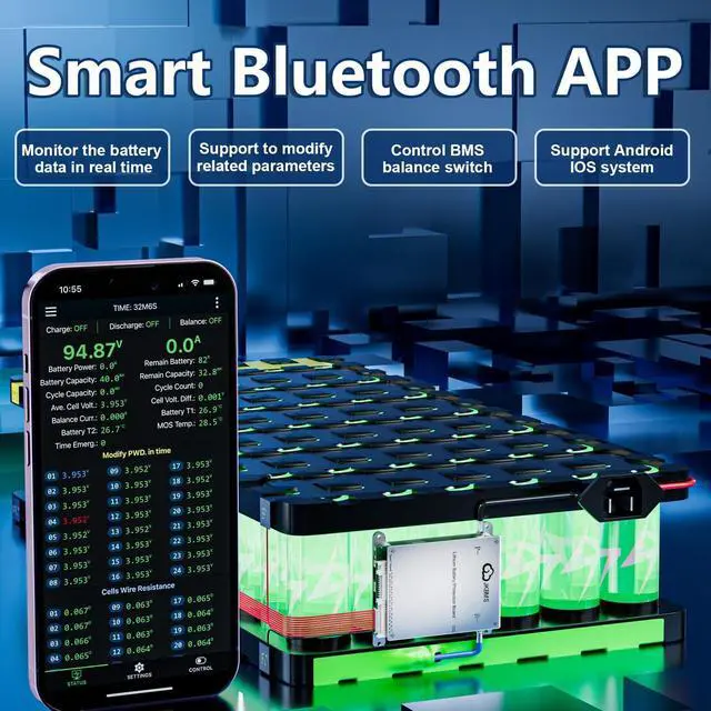 Easy Connection: Effortlessly manage your battery with JK BMS mobile app for Android and iOS. Bluetooth connectivity allows you to monitor status, adjust settings, and control charging/discharging from your device ^^
