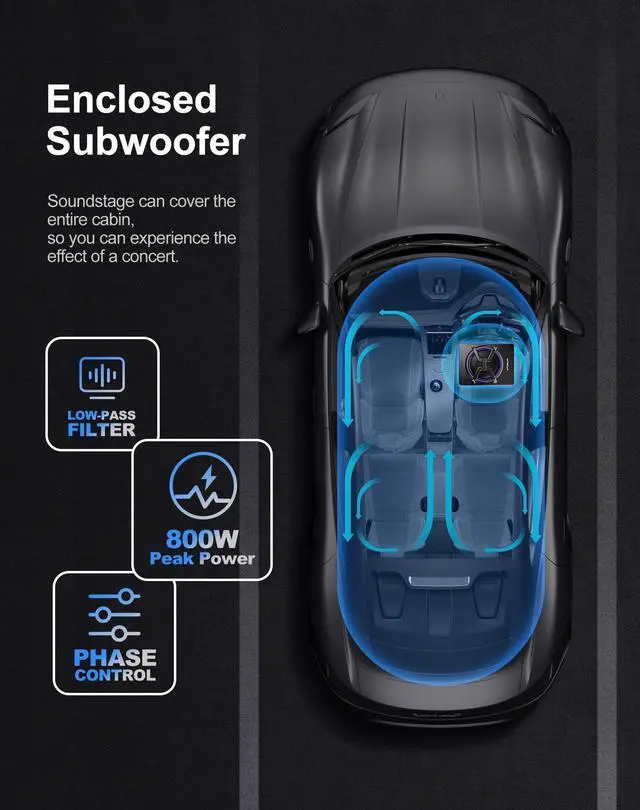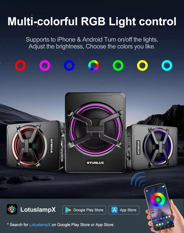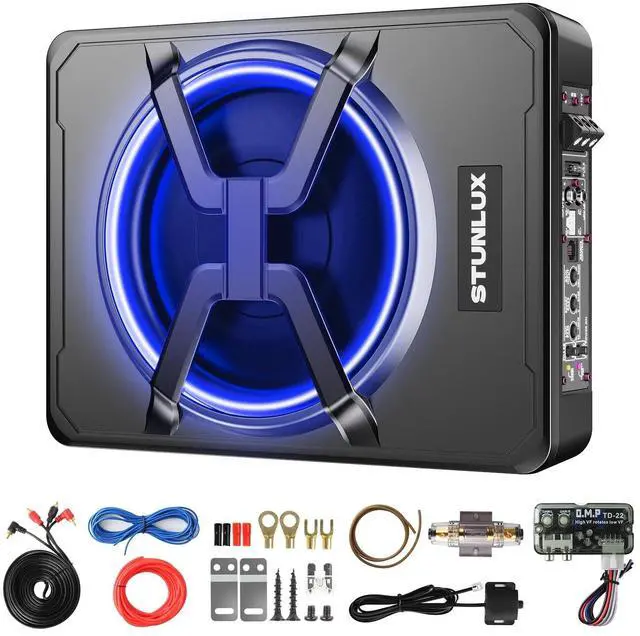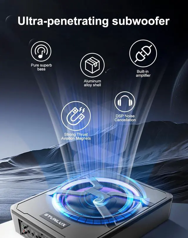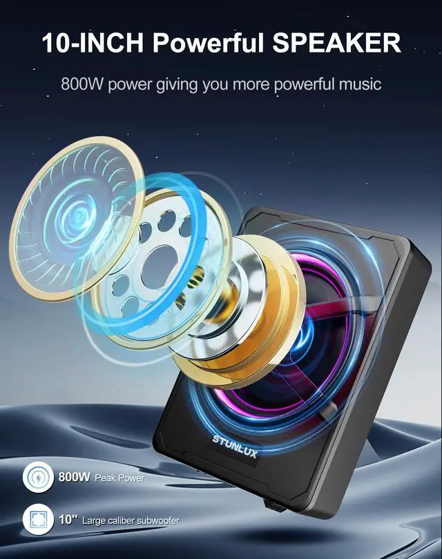 Elevate your audio experience with this powerful 10-inch subwoofer car that enhances your music quality and fits perfectly under your seat, saving space in your vehicle. ^^ Enjoy outstanding heat dissipation with the subwoofer car's cast aluminum shell, which offers 3x improvement in heat dissipation compared to traditional iron shells, keeping your subwoofer cool even in tight spaces. ^^ Adjust the volume and bass to your liking with the included remote control, featuring gain, bass boost, and crossover controls, for perfect sound at any volume. ^^ Upgrade your car's interior with the new 2024 upgraded version of this car subwoofer audio that features a sleek, X-shaped speaker protector and a colorful LED light ring that lights up with your car.
