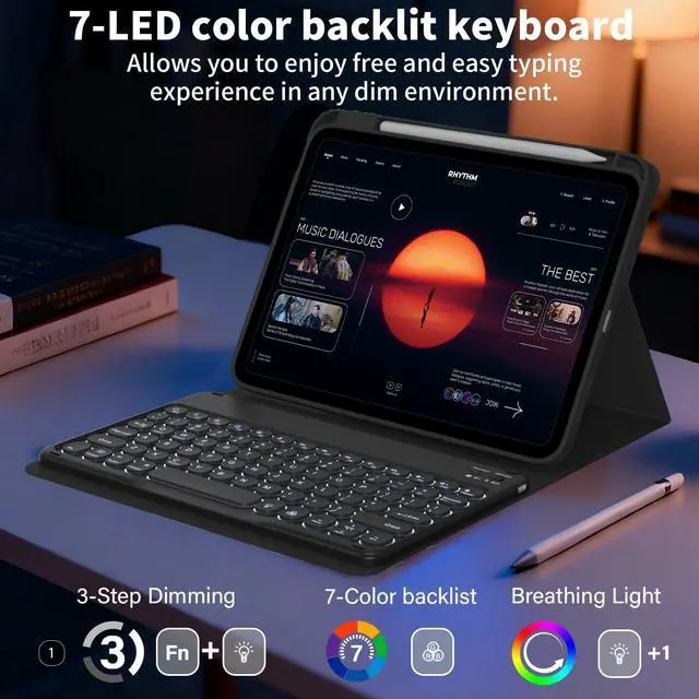 Generation 10.9 inch 2020 (Model: A2072/A2316/A2324/A2325). NOT compatible with any other iPad models. Please check the back bottom of your iPad carefully to find the Model Number before purchase ^^ Magnetic Detachable Bluetooth KeyboardThis iPad air 11-inch M4/M3/M2 (2026/2025/2024) with Keyboard Case comes with a magnetic detachable lightweight Bluetooth keyboard. The iPad air 10.9 inch (2022/2020) wireless keyboard pairs quickly with your tablet via a BT connection and attaches securely to the case via magnetism, instantly turning your tablet into a portable laptop, perfect for working, typing, editing, or watching videos, dramatically increasing the productivity of your iPad ^^ Built-in Pencil Holder & Quality MaterialsBuilt-in pencil holder, storage and charging in one. The pencil holder is set on the right side of the protective case, easy to put in and take out the pencil, so you will never lose your pencil again.