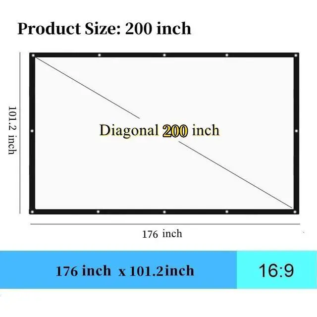 1.16: 9 Screen Format and Diagonal 200", Offering 176'' x 101.2 '' Viewing Area. 2. 200inch 16:9 Portable Projection Screen, Perfect for Handheld Projectors. 3. High Brightness, White Screen Material is Extremely Sturdy4. Compact One-Piece, Lightweight and Folding Design, Easy to Carry5. Easy to Install and Hang, Both Indoors and Outdoors6. Suitable for Home theater, Business meetings, Exhibitions, Conventions, Outdoor Picnic, Presentations, etc.