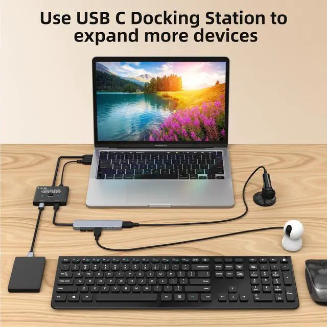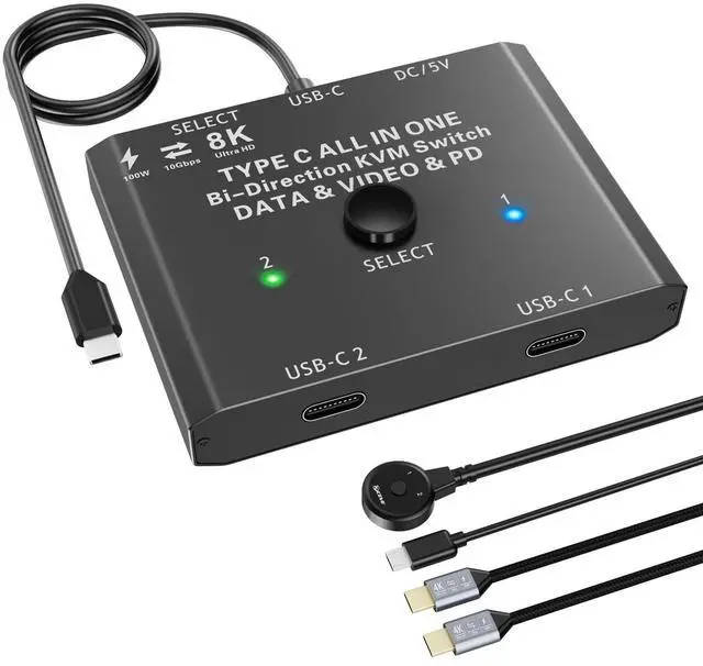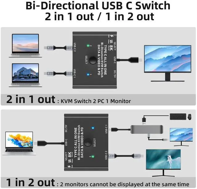 Note: 1 in 2 out mode can support switching between 2 monitors, and 2 monitors cannot be displayed at the same time. ^^ 8K@60Hz & 4K@120Hz USB C SwitchThis USB C switch supports outputting 8K@60Hz and 4K@120Hz video to a USB C or HDMI display. Support C to HDMI or DP adapter. Backwards compatible with lower resolution 1080P@165Hz, etc. Supports ultra-widescreen output, such as 3440*1440, 2560x1440. The final resolution and refresh rate depend on the compatibility of the input source device, monitor and connecting cable and adapter ^^ 10Gbps Data Transfer RateThe USB-C switch supports 10Gbps Data Transfer Rate and complies with the USB 3.1 Gen 2 protocol. Please use USB-C USB 3.1 Gen-2 specification cables. Do not use a USB C KVM switch with a docking station, as some incompatible docking stations cause the screen to flicker or go black. ^^ 2 Switch MethodsPlug and play, the indicator light shows the working status. The USB Type C switch supports two switching methods. The input source can be switched through the buttons on the USB C KVM panel and the 1.5 -meter wired remote ^^ Supports PD 100W Charging KVM switch USB C allows your laptop and other devices to be charged while working, supporting PD 100W charging efficiency.