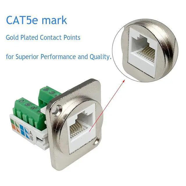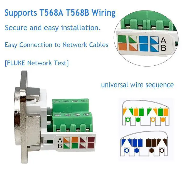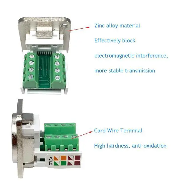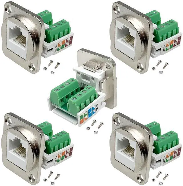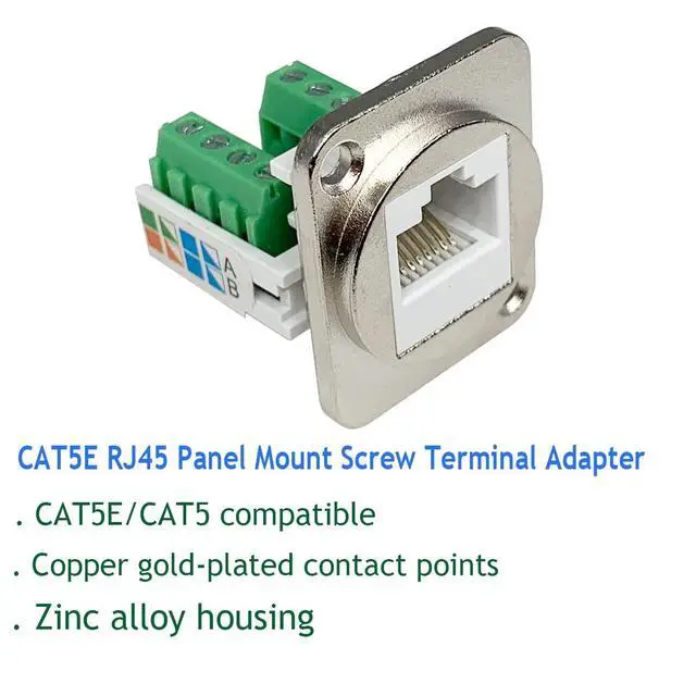 RJ45 CAT5E ConnectorProvides feed-through Cat5E Ethernet connectivity for data in industrial environments. ^^ Solderless RJ45 Screw Terminal AdapterNo soldering required. Just use a small screwdriver to open up the terminal blocks, slide in your stranded or solid-core wire, and re-tighten. Easy to Use. ^^ Smooth ConnectionThe wiring of the adapter complies with EIA/TIA 568B structured wiring standard, which can connect external network cables and transmit network signals with better shielding against electromagnetic interference. ^^ High QualityThis RJ45/8P8C panel mount terminal has a standard d-type mounting size for various scenarios. Sturdy and exquisite high quality plastic housing for durability.