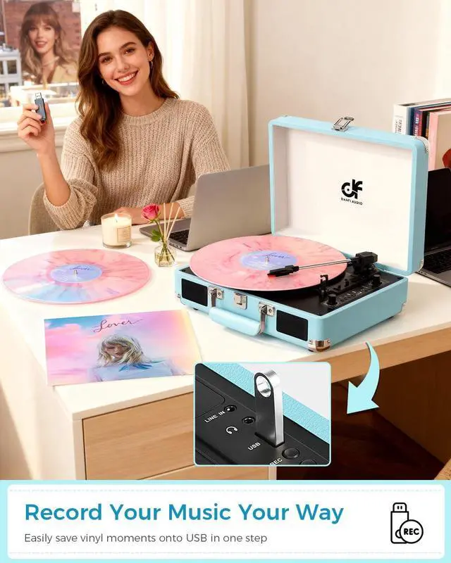 All-in-One Versatile Record Player- This record palyer features a suitcase design, bass and treble adjust, stereo speakers and 3-speed Turntable (33, 45, 78RPM) to play all 7", 10"& 12" vinyl records from new released albums to 50s 60s 70s 80s nostalgi collections. Start to revive the retro sound of your memories. ^^ Convert Vinyl to MP3 via USB Recording - Digitize your classic records with USB turntable converter technology. Ideal for vinyl to digital archiving and LP digitization projects. Use the flexible arm lifter picks up the stylus needle and drops it onto the record.