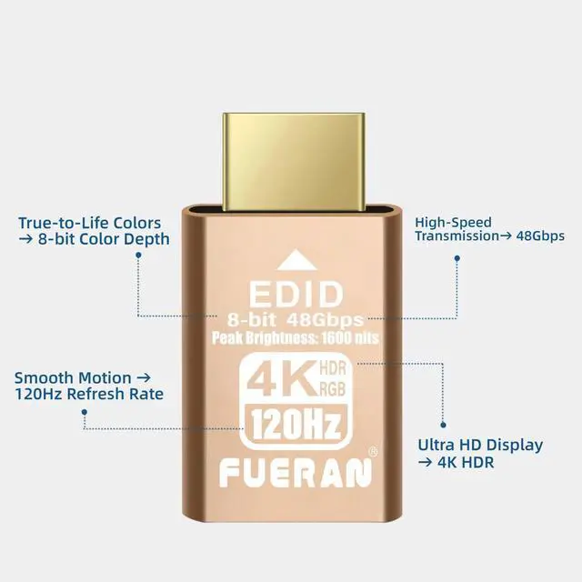 hdmi dummy plug notice: The graphics card interface must support HDMI 2.1 version to achieve 4K/120HZ refresh rate1. hdmi dummy plug 4K@120Hz HDMI dummy plug High refresh rate is a display emulator (virtual plug), after connecting Headless Ghost, your operating system will detect a virtual display and enable GPU, and this virtual display has the same function as real display. 2. GPU hardware is often disabled until a monitor is connected, resulting in poor performance and limited resolution for remote users to work on. 3. When the GPU is enabled, various tasks can be performed, including high resolution and refresh rate enabling hardware to accelerate GPGPU operations such as remote desktop and cryptocurrency mining, and the resolution supports 800x600@60/120HZ-3840x2160@60/120HZ.