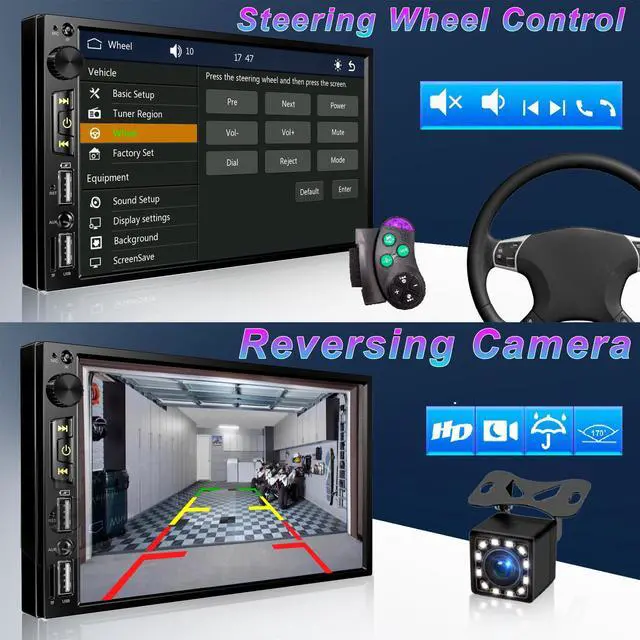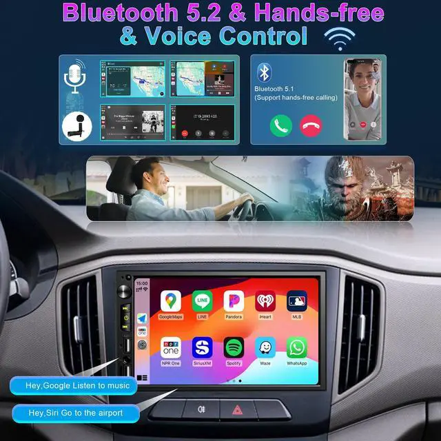 Wireless & Wired Apple CarPlay + Android AutoEasily connect your smartphone for hands-free calls, music streaming, and app use while driving. ^^ Bluetooth 5.2 for Hands-Free Calls and Music StreamingBluetooth 5.2 provides stable connections for calls and music, ensuring a safer and more convenient drive. ^^ Universal Double DIN FitThis system fits double-DIN installations 7 (W) * 4 (H) * 2.36 (D) inch, ensuring compatibility with a wide range of vehicles. ^^ HD Backup Camera with Night VisionIncludes an HD backup camera for safer reversing, with night vision for clearer visibility in low light.