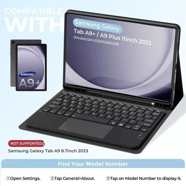 Compatible Models:This keyboard case can only fit the Samsung Galaxy Tab A9+/A9 Plus 11 inch 2023 release tablet. Model number: SM-X210/X216/X218,Please check your tablet model "SM-Xxxx" in your tablet "Settings" before purchasing. (Click "Settings-System-About Tablet Model")