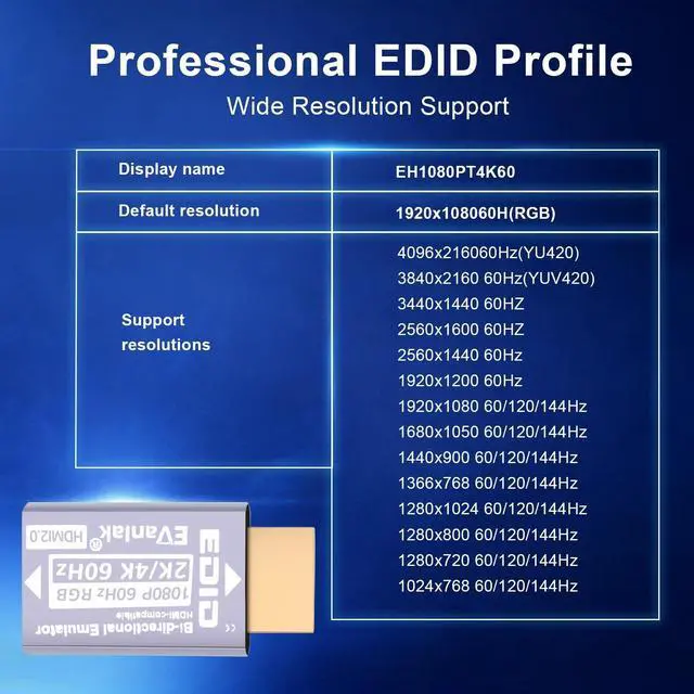 • Simulates HDMI Display: Emulates an HDMI display by providing Hot Plug Detect and EDID information to the HDMI device, making it appear as if a real display is connected.