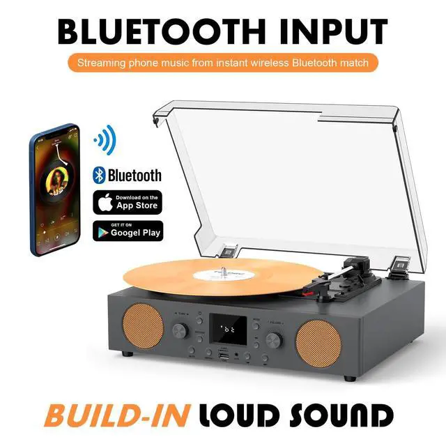 Vinyl Record Player, the great blend of vintage charm and modern technology. This record player features a classic design with built-in speakers for a rich audio experience. With FM radio capabilities and Bluetooth connectivity, you can easily listen to your favorite music from any era. Enjoy the warm sound of vinyl records while also being able to stream music wirelessly from your phone or tablet. Upgrade your listening experience with our Vinyl Record Player today.