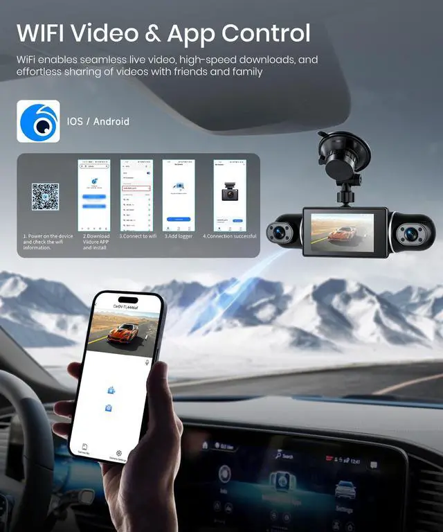 Collision Detection: Automatically records collisions or vandalism when parked (requires hardwire kit). ^^ HD Night Vision Dash cam 4 Channel is equipped with advanced night vision technology, providing outstanding image quality in various lighting conditions. It features eight infrared lights, ensuring clear recordings even in low light. ^^ Wi-Fi & Free App Control Support easily set up the dash cam recorded videos instantly using a free mobile app available for both iOS and Android devices. ^^ Reverse Assistance Rear camera features reverse imaging functionality. When your vehicle is in reverse gear, the recorder automatically switches to parking mode and provides reverse assistance lines to ensure safe parking.