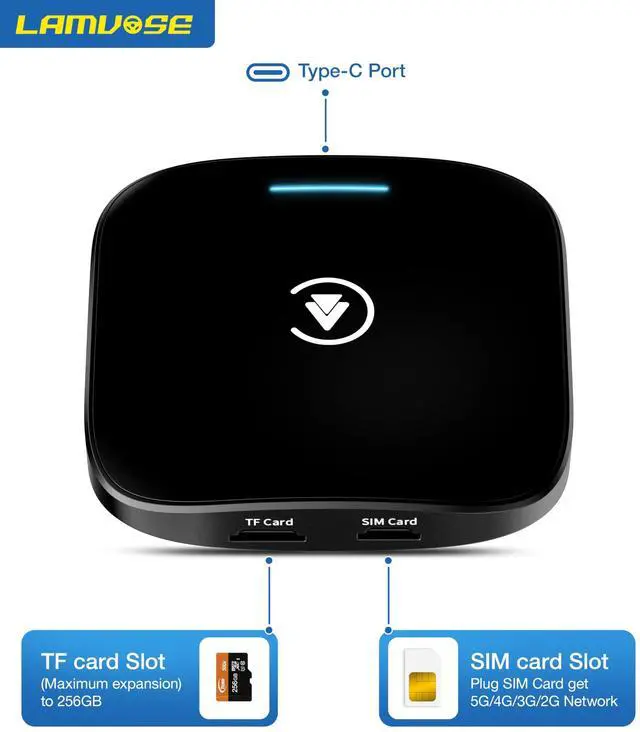 At the same time, the wireless carplay adapter also supports GPS/GLONASS/BeiDou Navigation Satellite System, accurate positioning of every corner, is your traveling good partner. ^^ TF Card & SIM CardAI box Carplay comes with 4GB RAM memory + 64GB ROM storage space, insert TF card to get extra storage up to 256G. In addition, magic box carplay has a more powerful function - wireless carplay adapter comes with a SIM card slot, insert the 4G-SIM card, you can use the carplay directly without phone, avoiding the problem of unstable cell phone WiFi connection and so on.