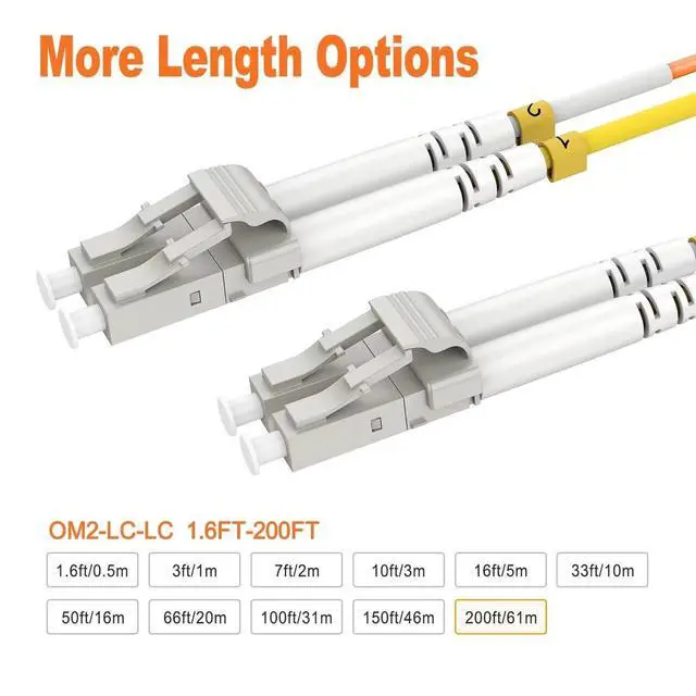 200ft/61m OM2 LC-LC Fiber Patch CableThe 50/125m OM2 multimode bend insensitive fiber optic cable is less attenuation when bent or twisted compared with traditional optical fiber cables and this will make the installation and maintenance of the fiber optic cables more efficient. OM2 LC LC fiber patch cable save more space for any places fiber patch cables are needed. ^^ Wide UsageOM2 LC-LC Fiber Optic Patch Cable Multimode 1Gb is designed for high density applications in gigabit ethernet, fiber channel, local area networks, data center, premise installation, wide area networks, commercial and so on.