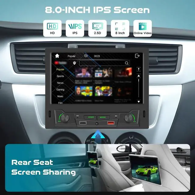 Online Video: 1 Din carplay car stereo supports screen mirroring function, allowing you to share the same video content on multiple screens in your car. This feature is perfect for family trips, providing a theater-like experience for passengers. The high-definition display ensures smooth operation and clear visuals for navigation and entertainment. And 1 din touchscreen car radio supports online viewing of You-Tube, allowing you to stream smooth HD videos directly in your car for enhanced in-vehicle entertainment. ^^ Comprehensive
