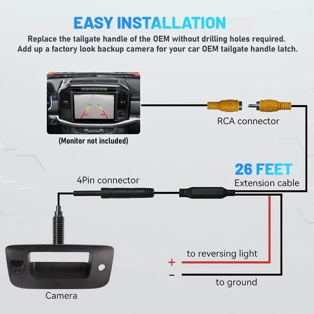 Last: Factory black textured liftgate handle camera is made of reinforced ABS plastic and steel, survives jobsites and car washes; Rust-proof for coastal/snowy areas 3x longer life than cheap handles