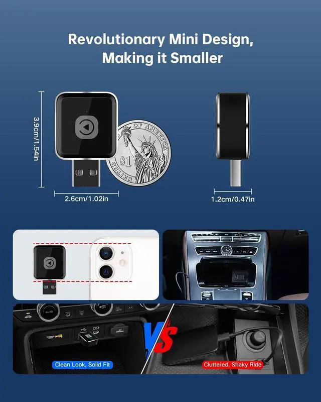 ^^ Dual-Band Wi-Fi for Stable Connection Supports 2.4GH z & 5.8GH z Wi-Fi to reduce interference and keep CarPlay responsive, even in busy urban environments. ^^ Fast Connection, Low Latency ExperienceTypically connects in about 1020 seconds after engine start. Smooth navigation, calls, and music for everyday driving. ^^ Keeps All Factory Controls Continue using your touchscreen, steering wheel buttons, and voice control just like wired CarPlaysame interface, just wireless. ^^ Compact Mini Dongle, Clean Interior Low-profile design sits neatly in the USB port without blocking space or creating cable clutter on your dashboard.