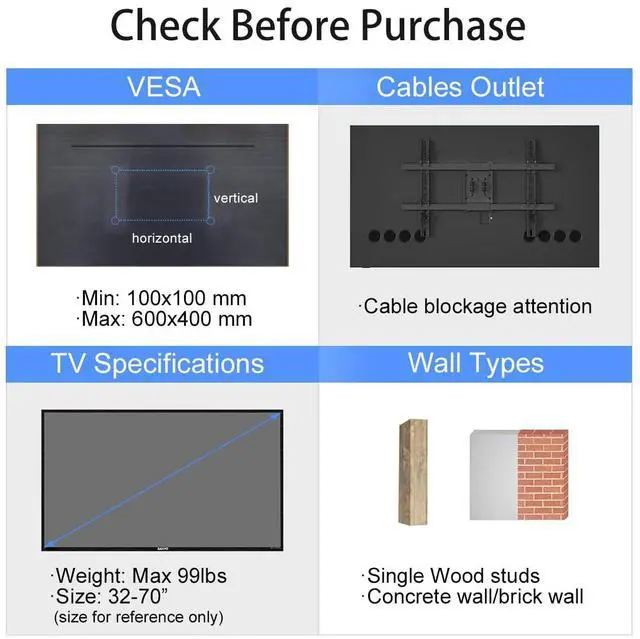 Versatile Compatibility- The Long Arm TV Wall Mount is compatible with most 32''-70" screens and can hold up to 99 lbs, making it suitable for a wide range of TV sizes and weights. It supports VESA min 100x100mm and max 600x400mm, ensuring compatibility with various TV models. Whether you want to install it in your living room, bedroom, office, or any other place where a TV is needed, this wall mount is the perfect choice. ^^ 30" Long Extension- If you're looking for a TV wall mount with a flexible extension, look no further.