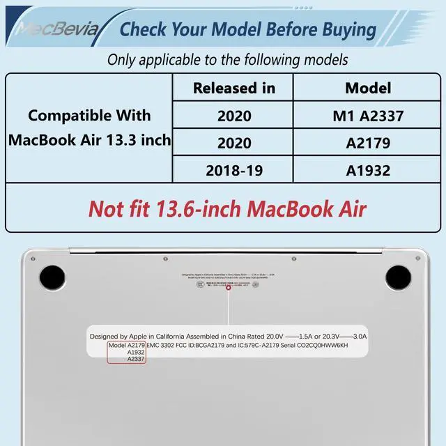 • Note: This case is designed exclusively for the 13.3-inch MacBook Air with Touch ID 2021 2020 2019 2018 Release (Compatible models only Models: A2337 M1 A2179, A1932). Not compatible with MacBook Air 13.6-inch with M2 M3 chips. Please check the model number on the bottom of your MacBook to ensure compatibility