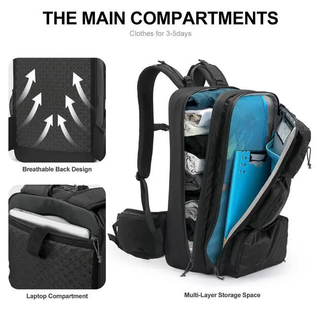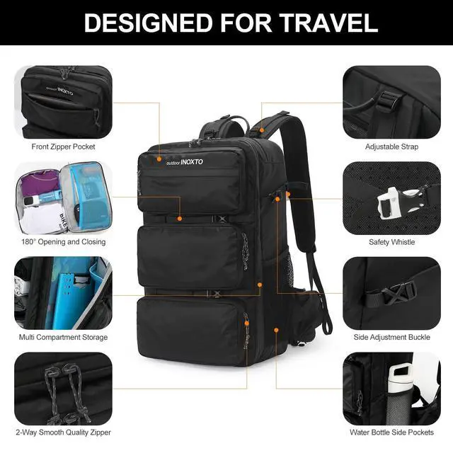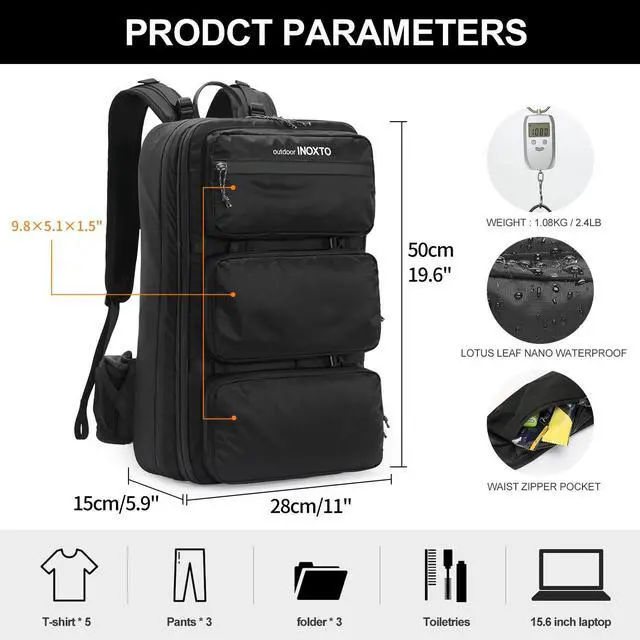 LARGE CAPACITY MULTIFUNCTIONAL BACKPACKThis casual travel backpack with many compartments is meet the needs of daily 3-5 days trips. It has a spacious main compartment fit 5-8pcs pieces of thin tops or pants. A file compartment with various pockets can store document, earphones, electronic devices etc. 3 multifunctional front zip pockets store toiletries. Laptop compartment x 2 (suitable for 13" tablet and 15.6" laptop respectively). ^^ APPROVED BY MOST FLIGHTSThe personal item travel bag external dimensions are 19.6115. 9 inches (HWD), Weight: 1.08 kg ( 2.3 lbs). This backpack meets the boarding requirements and the portable zipper can be opened and folded 180 degrees like a suitcase facilitates you to quickly pass the airport security check. Travel laptop backpack fits overhead and under the seat. Reflective strips on the shoulder straps make night travel safe. ^^ DURABLE & COMFORTABLE DESIGNIX INOXTO travel backpack is made of high-quality water-repellent and tear-resistant nylon fabric lightweight, anti-wrinkle with a lotus leaf-like waterproof effect. Comfortable airflow back design, thickened and soft EVA panels provides back support and helps air convection, ventilation and heat dissipation. Adjustable S-shaped shoulder straps and a chest buckle to relieve shoulder pressure. ^^ WIDELY USEDThis stylish carry on travel backpack can be used in several different ways, served as daily backpack, spacious travel backpack for laptop is suitable for commuting, business, work, hiking, short-term travel, overnight, weekend vacation and other activities. An amazing gift for men and women who love to travel, and the best choice for Father's Day, Christmas and other holiday gifts. ^^ PROMISEWe promise to provide the best products and services to all buyers who believe in and choose our products.