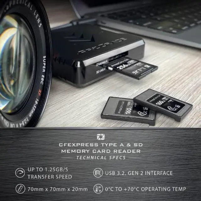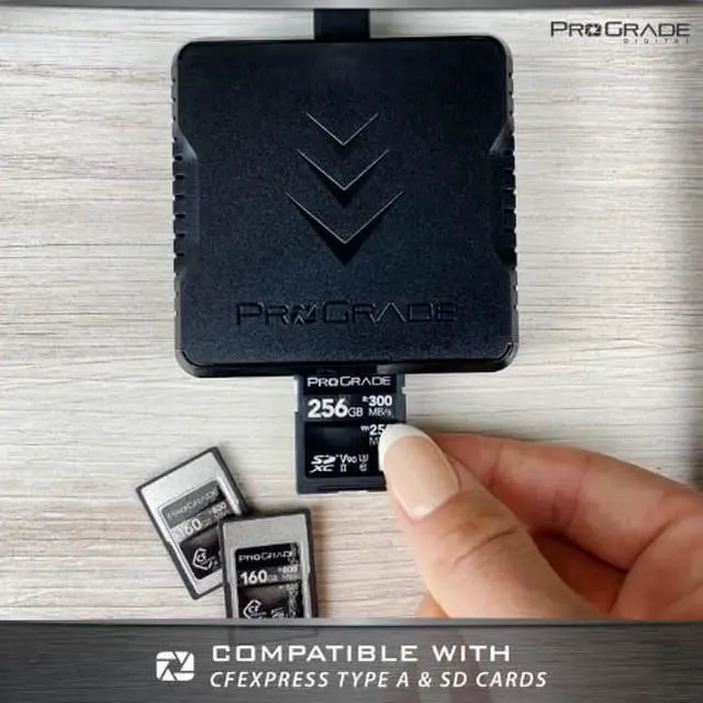 ProGrade Digital offers an industry-leading high-speed workflow reader that matches our high-speed memory cards. The dual slot PG-09 CFexpress Type A and SDXC reader uses the new USB 3.2, Gen 2 interface with the ability to read CFexpress Type A and SDXC memory cards at speeds of up to 1.25 GBytes per second. This type of performance means you can download content from our CFexpress Type A and SDXC cards at over 1250MB per second.