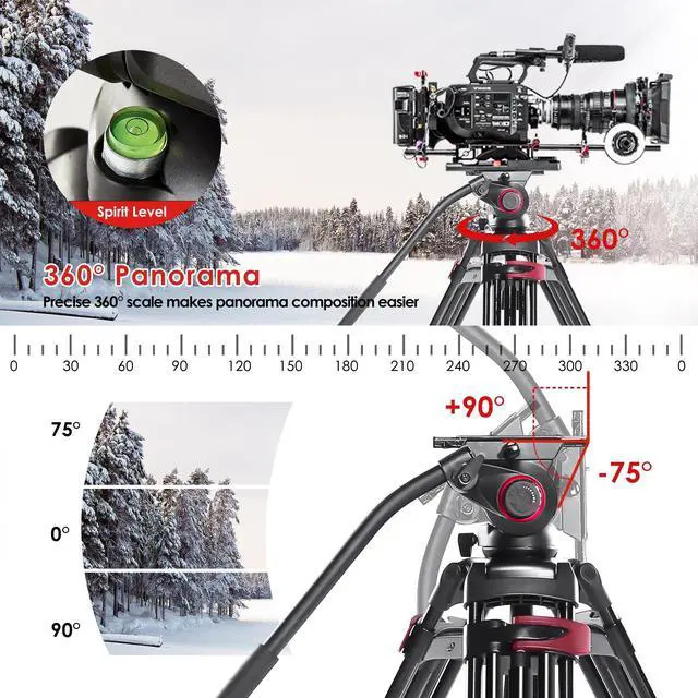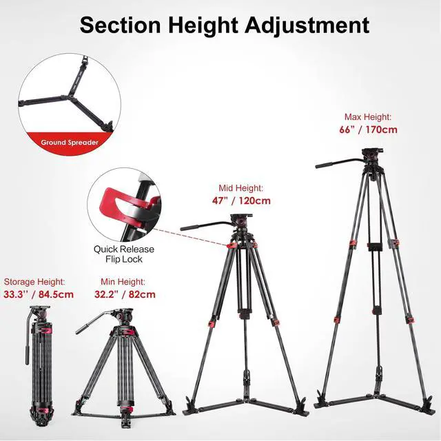 ^^ [Adjustable Fluid Head for Smoother Operation]The MYT803 head features an adjustable damping system with horizontal and vertical adjustment knobs, enabling precise fine-tuning of damping according to user preferences and equipment size. Utilizing triple-layer precision steel bearings and high-viscosity anti-freeze damping fluid, it delivers a smoother, more comfortable control experience and more natural footage. Supports 360 horizontal rotation and -75 to +90 tilt angles to accommodate diverse shooting needs. The core dynamic balancing function provides responsive power assistance across the full tilt range and features automatic leveling recovery to ensure image stability. ^^ [6-Stage Height-Adjustable Tripod with Ground Extender]This professional heavy-duty tripod offers effortless 6-stage height adjustment ranging from 18.5 to 65.8 inches.