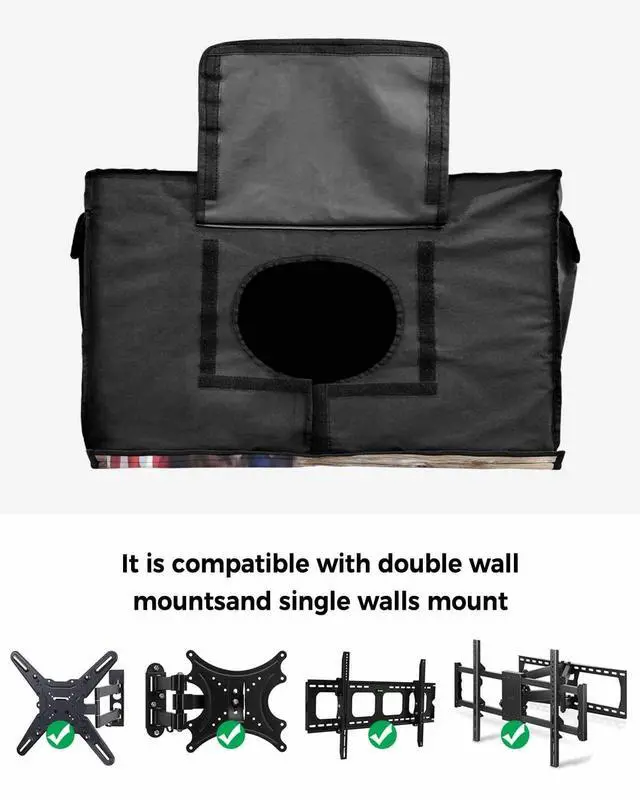 Outside TV Cover - TV Mount CompatibleThe remote control pocket on the back is designed so that the TV cover fits the most universal TV wall mount brackets, double wall, single wall, tilting TV mount and can accommodate a variety of mounting brackets. Outdoor TV Covers - 3 Pockets DesignThe added pocket on the back of the TV cover for moving is a great feature for storing remote controls, keeping them within easy reach, and the 2 side pockets can also be used to store other items. TV Outdoor Cover - Easy to InstallDesigned with hook tape, this TV cover for outside is more and convenient than zippers, making it easy to slide onto any TV and install.